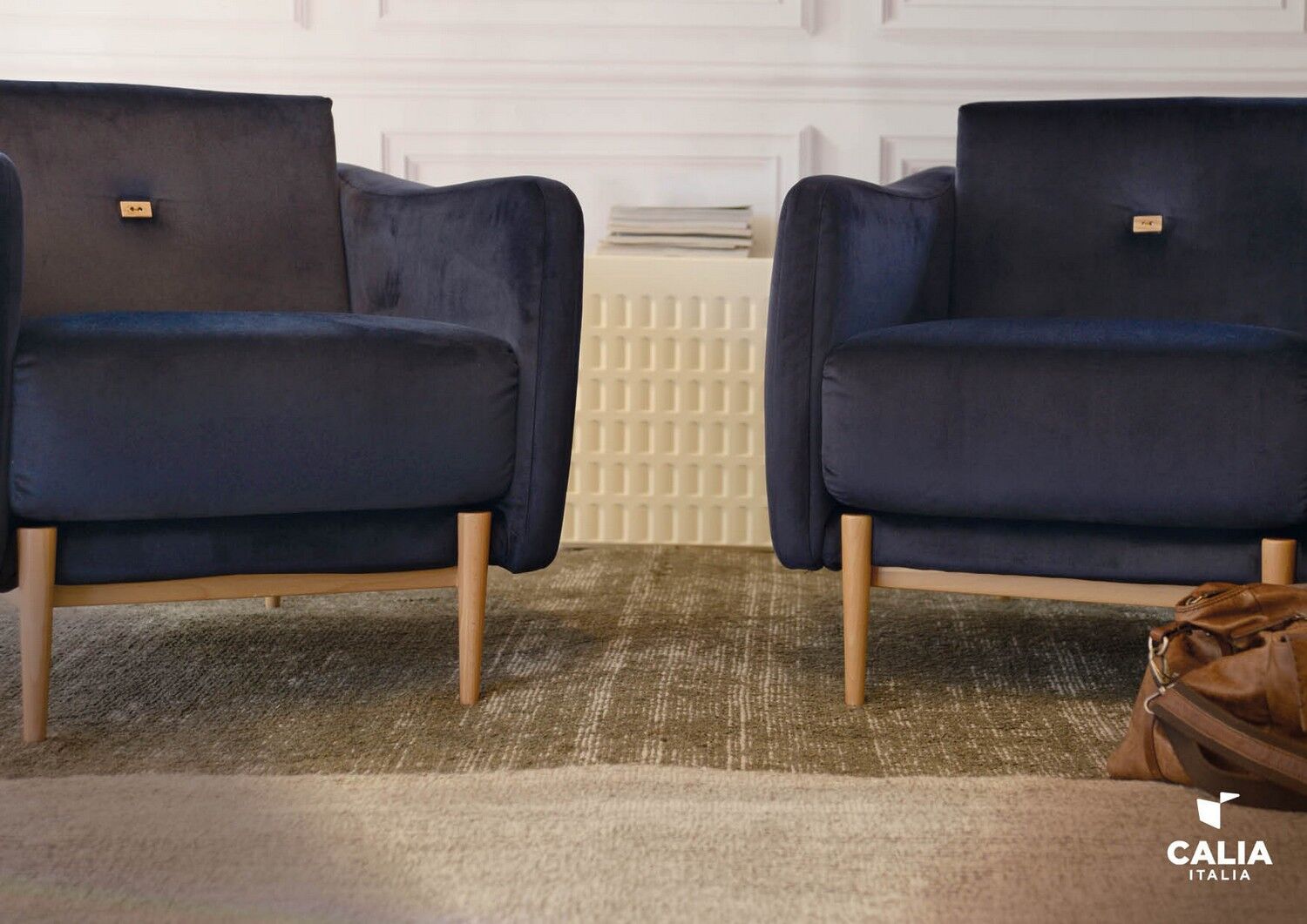 Trzeźwe i istotne linie. Styl nordycki, inspiracja z lat 60. Pojedynczy guzik podkreślający centralne pikowanie na plecach oraz cienka i wysoka kolczasta stopa uwydatnia podłokietnik w stylu secesyjnym o zakrzywionym i falistym profilu. To wszystko to Poli, mały fotel zaprojektowany przez Calia Italia, który nadaje styl nawet małym przestrzeniom, oferując komfort zawieszony między przeszłością, a przyszłością.