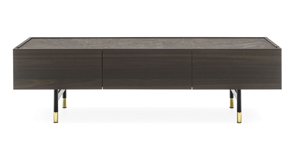 Horizon z 2 drzwiami bocznymi i 3 środkowymi szufladami, konstrukcja drewniana. Centralne szuflady bez uchwytów są wyposażone w system otwierania push-pull. Wszystkie przedziały są wyposażone w półkę z przezroczystego hartowanego szkła. Horizon wzbogacony jest o szklaną lub ceramiczną górną półkę oraz elegancką metalową podstawę o prostokątnym przekroju. Horizon to duża szafka do przechowywania, która idealnie nadaje się do przestronnych i wyrafinowanych jadalni, salonów. Odkryj wszystkie szczegóły!