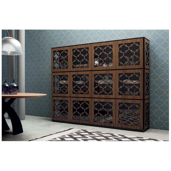 Prezentacja Marrakesh firmy Tonin Casa jest idealna do obszarów wymagających ekspozycji i przechowywania. Wycięcia na drzwiach przyciągają wzrok i sprawiają, że jest to piękny punkt centralny w nowoczesnym domu. Dzięki mocnym i solidnym półkom jest wystarczająco dużo miejsca na elegancką porcelanę i inne przedmioty, wszystko z łatwością pomieści. Wyeksponowanie elementów wystroju domu na górze dodaje gustu. Wyprodukowana we Włoszech w celu zapewnienia jakości, dostępnych jest kilkanaście konfiguracji, a opcjonalne światło LED z pilotem lub bez. Struktura jest dostępna w różnych wykończeniach drewnopodobnych, a panel tylny może pasować do drewna lub mieć brązowe lustrzane wykończenie.