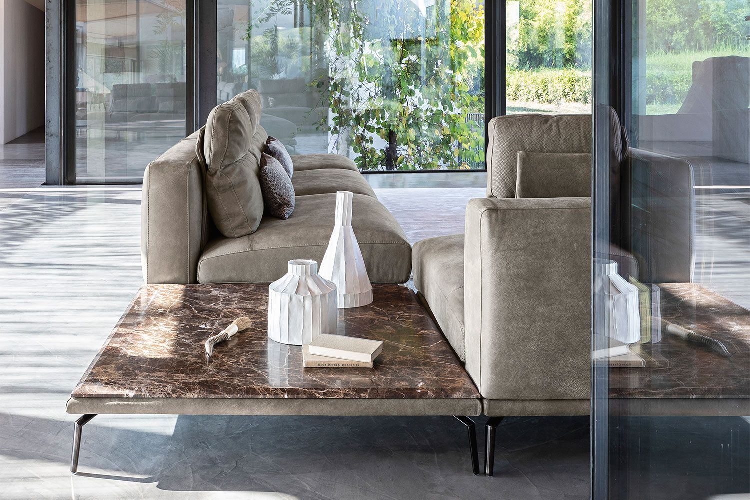 Idealna w każdym ustawieniu, sofa Babila ma sztywną konstrukcję, przerywaną miękkimi liniami lekko pochylonych poduch oparciowych i zagłówków. Pełna wygodnych funkcji sofa to jedyny w swoim rodzaju produkt ze zintegrowanym stolikiem bocznym między dwiema poduszkami i wygodnym szezlongiem. Dzięki miękkiej tapicerce i amortyzującej wyściółce zapewnia wygodę przez wiele godzin. Dostępna w wersji ze skóry i tkaniny.