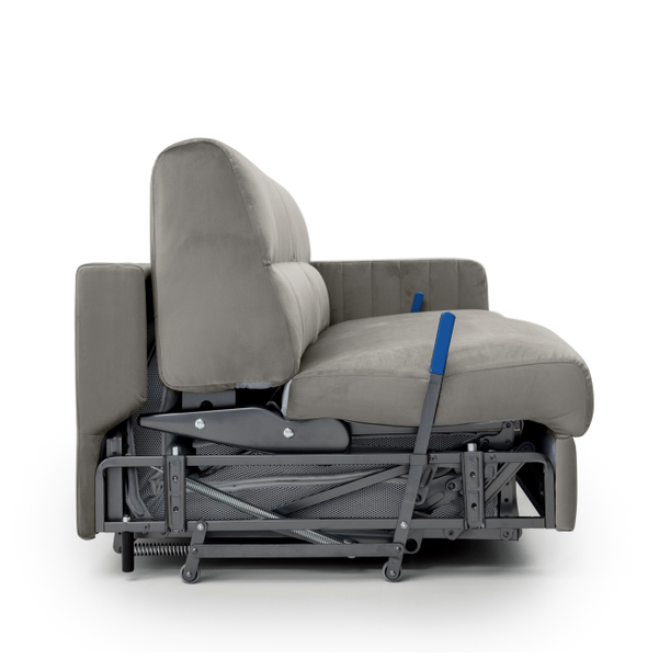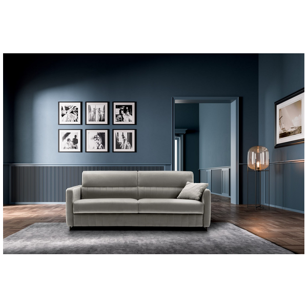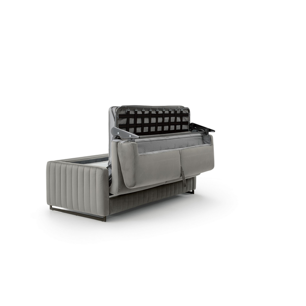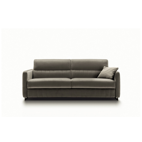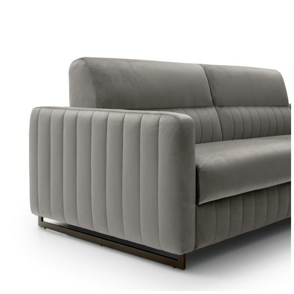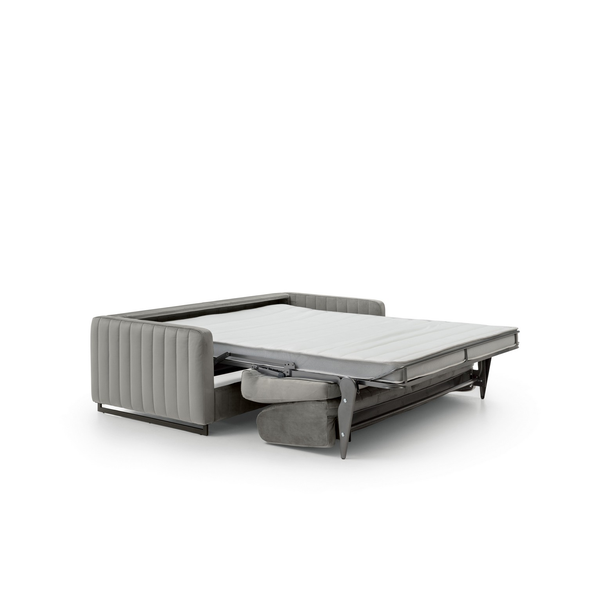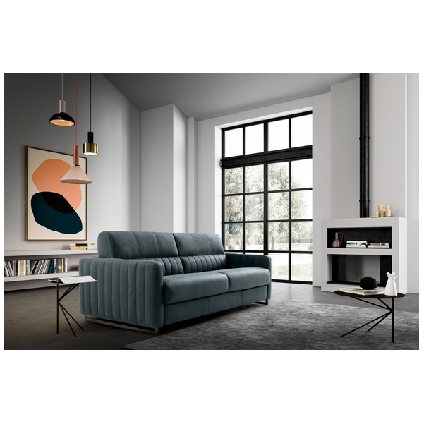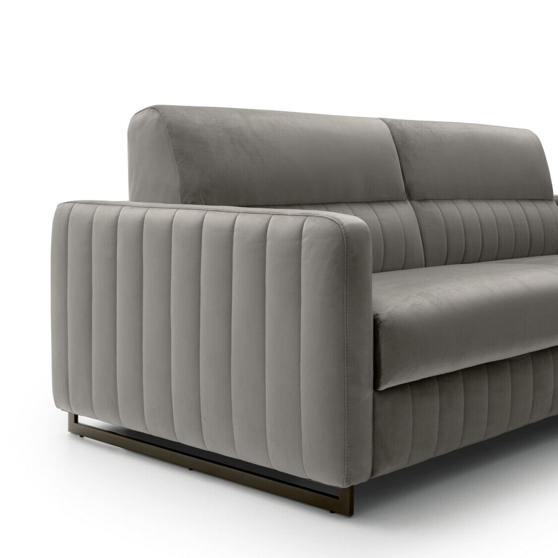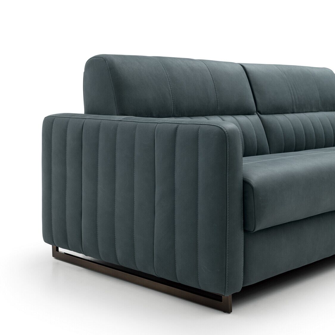 Rozkładana sofa Kleo od Nicoline Italia to obowiązkowy dodatek do nowoczesnego domu, który potrzebuje więcej opcji aranżacji. Elegancka sofa rozkłada się jednym szybkim ruchem, zmieniając ją w wygodne łóżko. Aby zwiększyć atrakcyjność, poduszki siedziska składają się pod materacem, podczas gdy poduszki oparcia również składają się do tyłu. Dzięki misternym pikowanym szwom na miękkiej tapicerce tworzy wzór w paski, który przyciąga wzrok. Idealnie nadaje się do domów, w których liczy się przestrzeń, jako atrakcyjny mebel. Wyprodukowana we Włoszech, aby zapewnić jakość, sofa do spania Kleo jest dostępna w dwóch rozmiarach, aby zaspokoić indywidualne potrzeby. Opcje tapicerki obejmują szereg tkanin i skór, szwy są wykonane z dopasowanych, jaśniejszych lub ciemniejszych kolorów. Nogi są w różnych kolorach metalu.