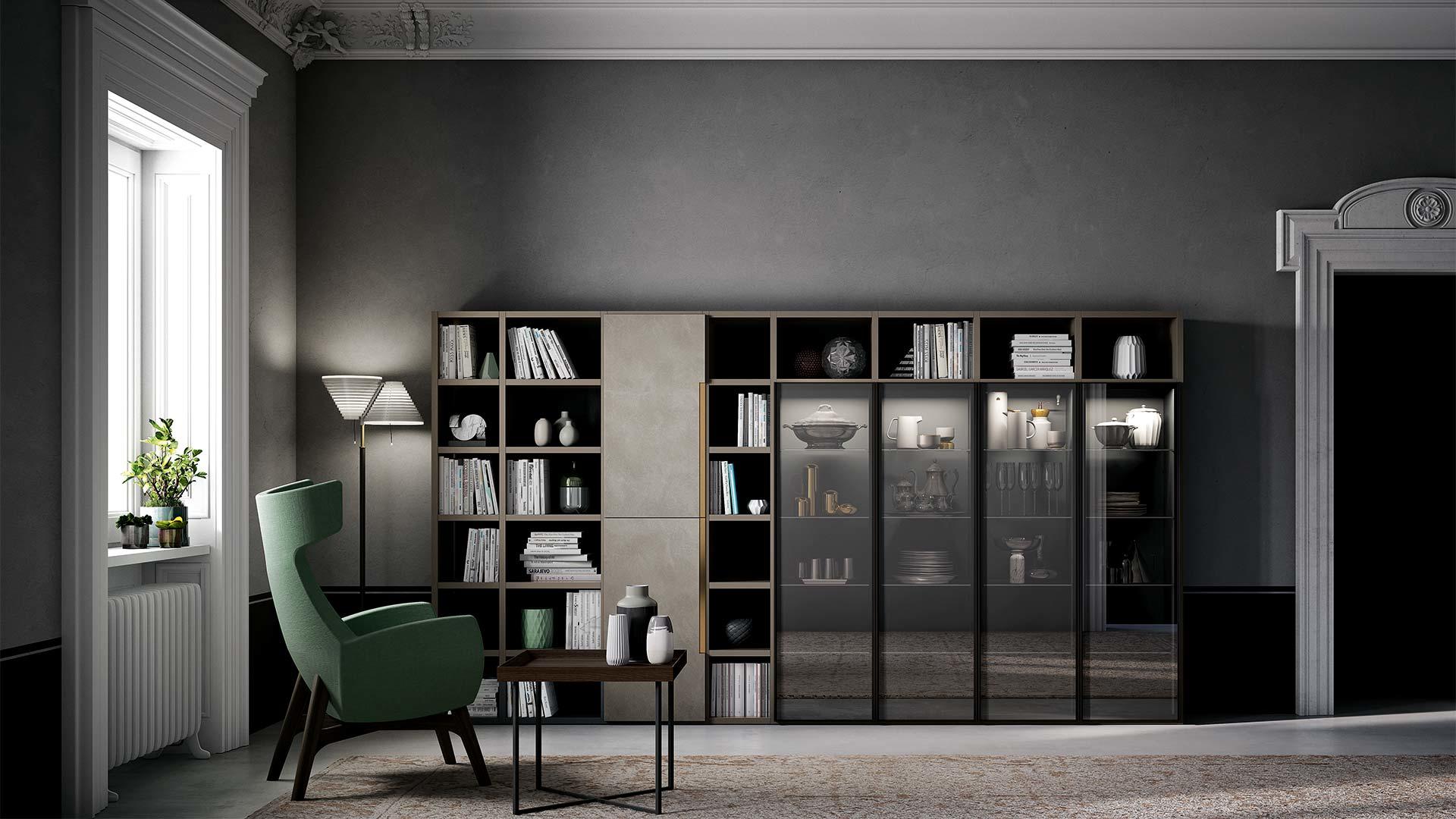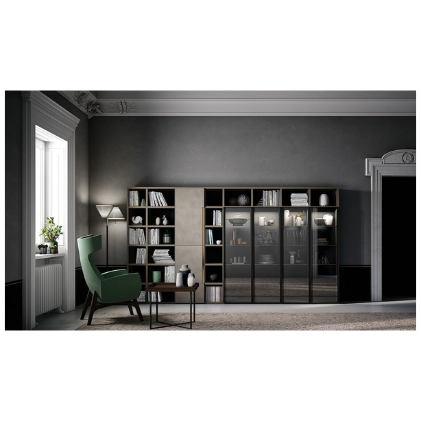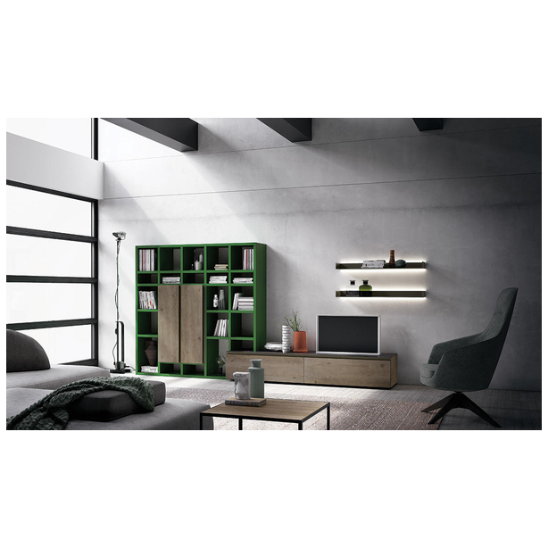 Tylny panel regału można wykonać w innym kolorze, aby przełamać schematy; półki następują po sobie o różnej grubości, mniej lub bardziej cienkie, od 30 do 15 mm, do ustawienia w wybranej pozycji; różne głębokości i grubości zmieniają się dzięki wstawieniu kontrastujących lub ton w ton elementów metalowych. Regały Speed ​​mogą być bardzo wysokie, ze względu na szeroką modułowość zarówno pod względem wysokości, jak i szerokości, telewizor leży pośrodku nośnika multimedialnego, półki są pokolorowane w różnych tonacjach: biały i szary dla eleganckiego i minimalistycznego wyposażenia, ciepła impregnowany dąb z jasnoszarymi detalami dla eleganckiego salonu.