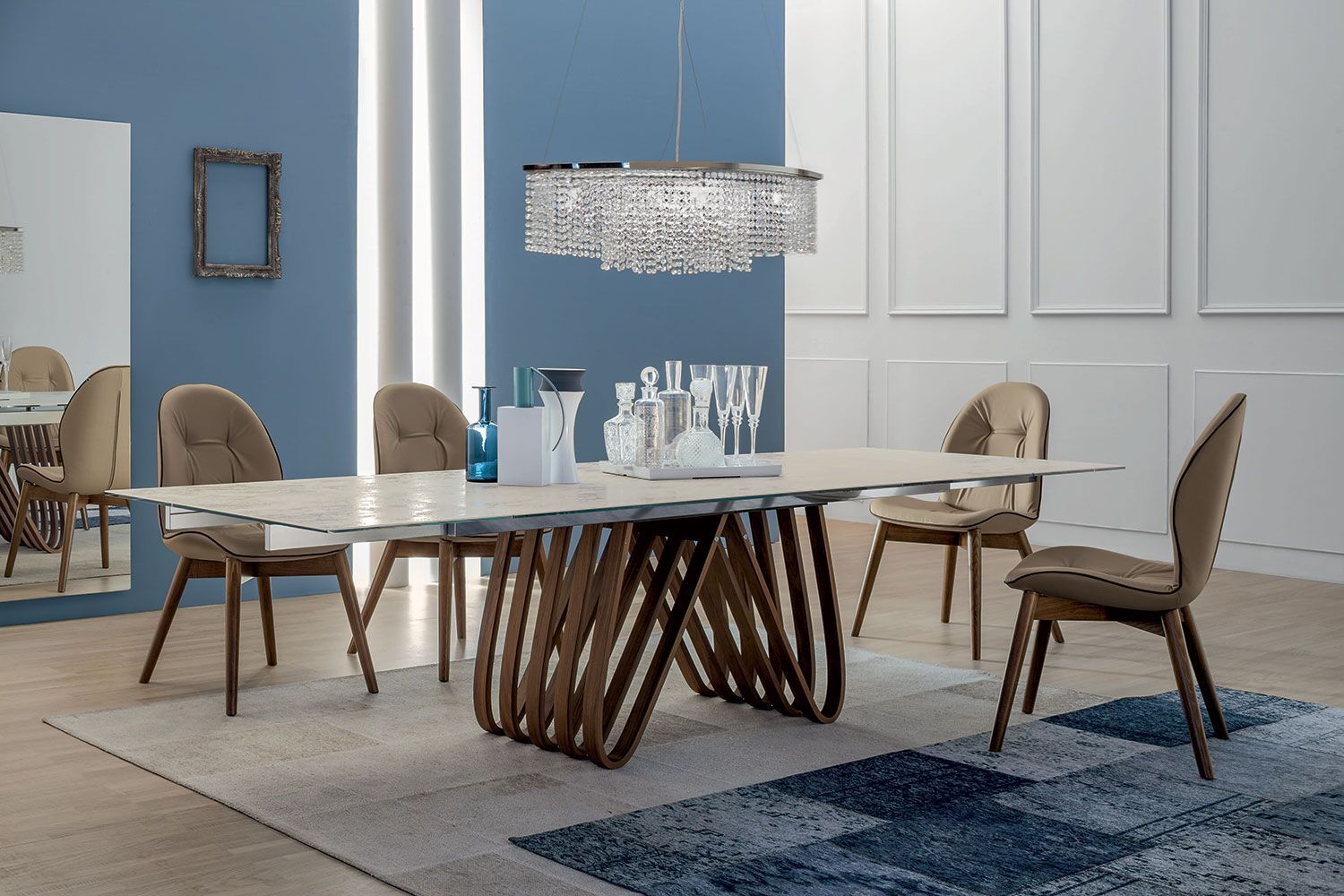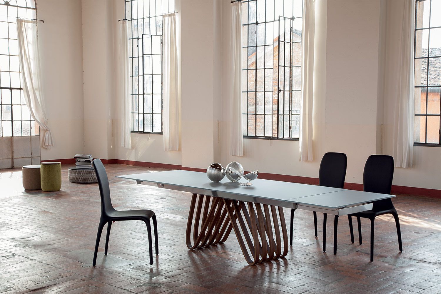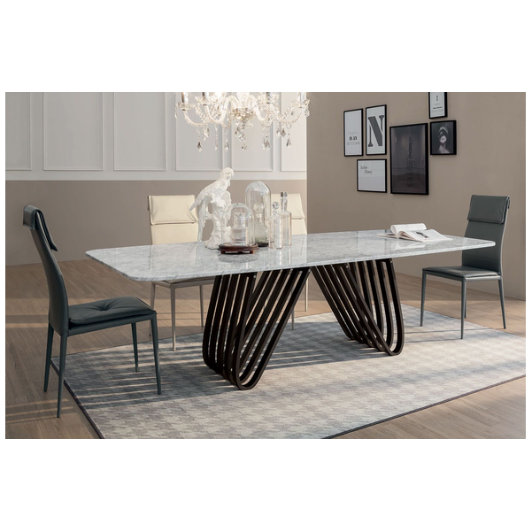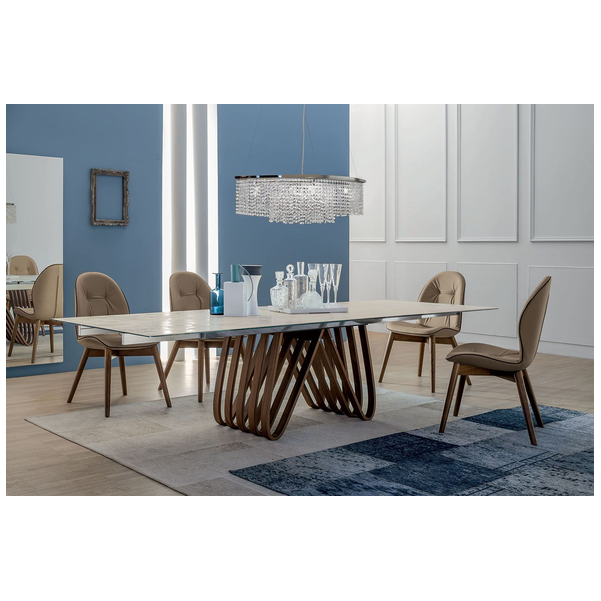 Stół Arpa to produkt obowiązkowy dla rodzin wielodzietnych. Rzeźbiarska podstawa jest inspirowana harfą i zawiera kombinację przyciągających wzrok krzywizn i ostrych kątów, które zapewniają geometryczny akcent. Z wieloma zakrzywionymi drewnianymi akcentami u podstawy, jest nie tylko estetyczny, ale także bardzo dobrze wspiera. Dostępny jest w czterech rozmiarach i posiada dwustronny mechanizm wysuwu z prowadnicami w różnych wykończeniach. Blat jest dostępny w różnych wersjach ze szkła, ceramiki, porcelany i marmuru. Blat Laminam® Ceramic to połączenie 3mm ceramiki połączonej z 8mm szkłem. Porcelanowy blat to połączenie 6 mm porcelany połączonej z 10 mm szkła. Blaty ceramiczne i porcelanowe są wykonane przy użyciu zaawansowanych technologii, które skutkują zmniejszoną grubością, podwyższoną odpornością na naprężenia mechaniczne, produkty chemiczne, zarysowania, głębokie otarcia i zginanie. Jest łatwy w utrzymaniu czystości, odporny na zimno, ogień, pleśń i promienie UV.