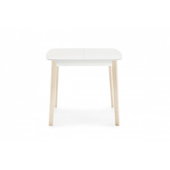 Stół z kwadratowym rozkładanym blatem i drewnianymi nogami.
