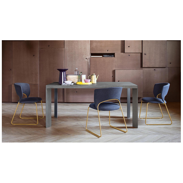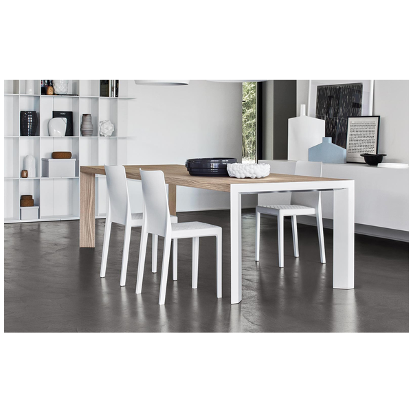 Stół posiada doskonale zintegrowany system ukryty w ramie: nogi przesuwają się na jedną stronę, co pozwala na umieszczenie na miejscu nadstawki w kolorze blatu. W ten sposób nogi zawsze pozostają w rogach, a ich walory estetyczne, wynikające z ukośnego ułożenia i powlekanego profilu metalowego, są podkreślone. Lam oferuje niezliczone możliwości kombinacji zarówno w środowisku domowym, jak i roboczym. Wybierz go, aby dodać charakteru do jadalni lub gabinetu.