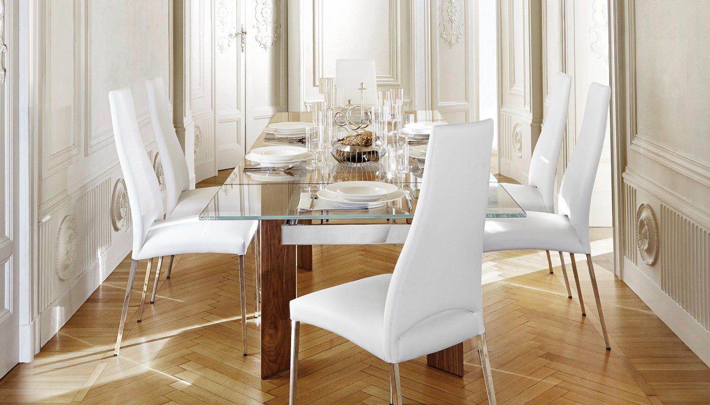 Stół rozkładany Tower ma drewniano-metalową ramę z prostokątnym blatem szklanym lub szklano-ceramicznym. Dwa boczne przedłużenia można wyciągać pojedynczo, wystarczy pociągnąć je do siebie, aby wysunąć je spod blatu i wyrównać jednym prostym ruchem. Po rozłożeniu wygodnie pomieści do 10 osób.