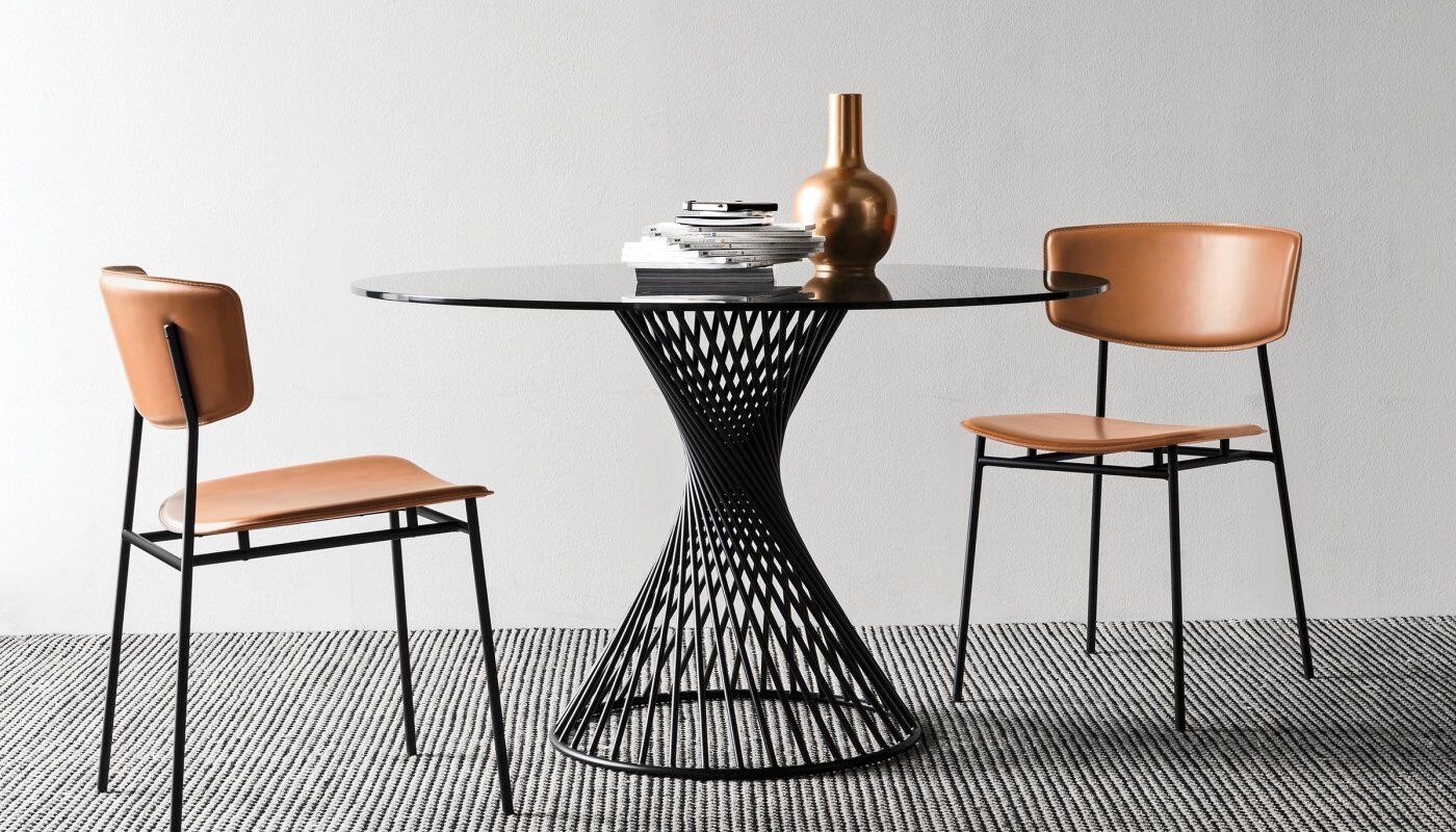 Okrągły stół Vortex tworzy silne poczucie przynależności między ludźmi, wspomagając rozmowę po prostu swoim kształtem. Wrażenie to jest podkreślone przez Vortex dzięki dekoracyjnej i funkcjonalnej centralnej podstawie, która dzięki spiralnej ramie z metalowej rury nadaje stołowi osobisty charakter. Szklany lub szklano-ceramiczny blat doskonale komponuje się z metalową podstawą i jest przymocowany do ramy za pomocą trzech okrągłych stalowych płyt.