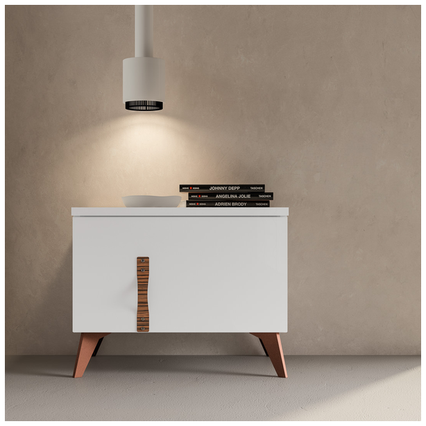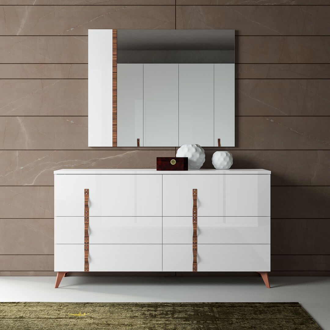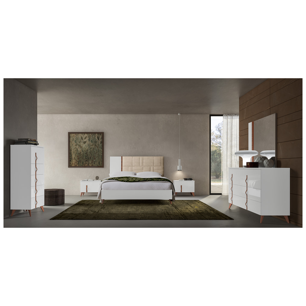 Wyrafinowanie i dbałość o szczegóły. Stylowy, nowoczesny zestaw do sypialni Sirio, wyprodukowany we Włoszech przez Status, ma białe wykończenie na wysoki połysk, drewniane akcenty z nogami w tym samym kolorze i zagłówkiem obitym ekoskórą. Łóżko ma stelaż z drewnianych listew. Zestaw składa się z łóżka typu queen size, 2 szafki nocne, podwójna komoda i lustro.