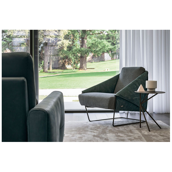 Inspirowany geometrią, praktyczny fotel Gioia firmy Nicoline Italia jest idealnym elementem do nowoczesnego salonu. Pochylone pod kątem podłokietniki mają trójkątny kształt z boku i zestawiają się z kwadratowym oparciem i siedziskiem, co przyciąga wzrok. Dzięki miękkiej i luksusowej tapicerce zapewnia komfort przez wiele godzin. Wyprodukowany we Włoszech, aby zapewnić jakość, fotel Gioia jest dostępny w szerokiej gamie tkanin i skór. Metalowa podstawa ma różne wykończenia, a szwy mogą pasować do materiału lub mieć jaśniejszy lub ciemniejszy kolor.