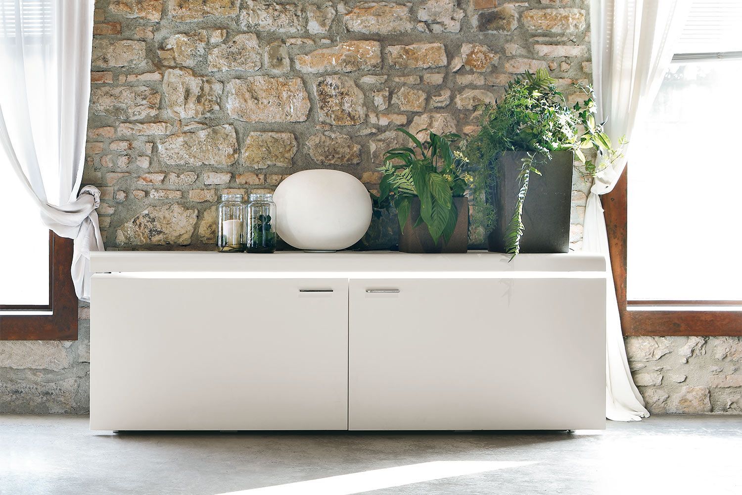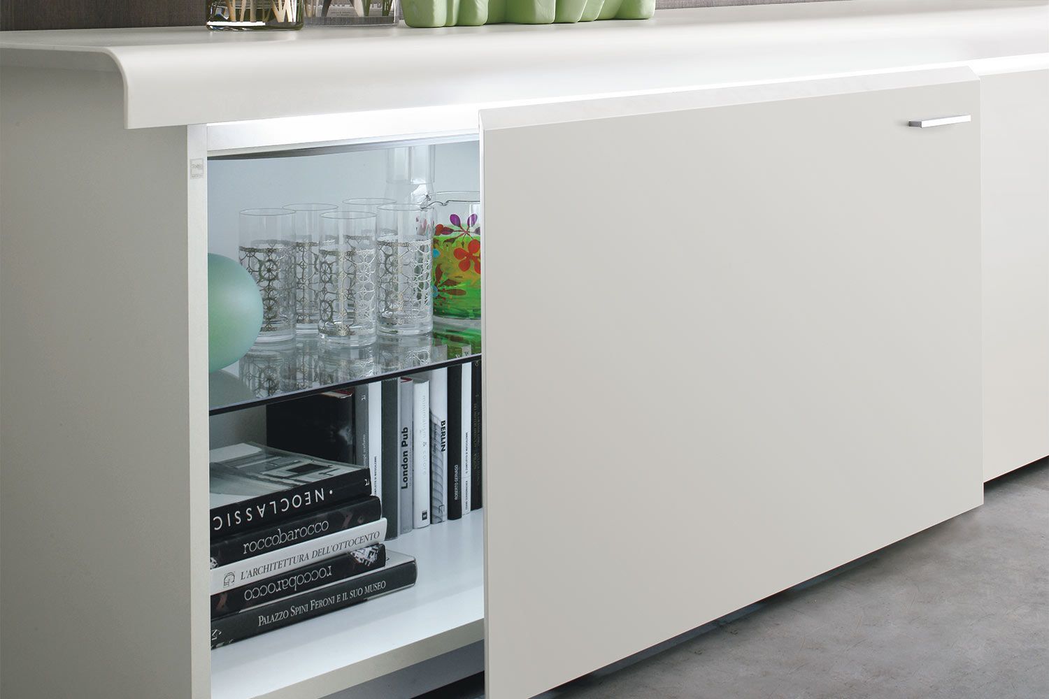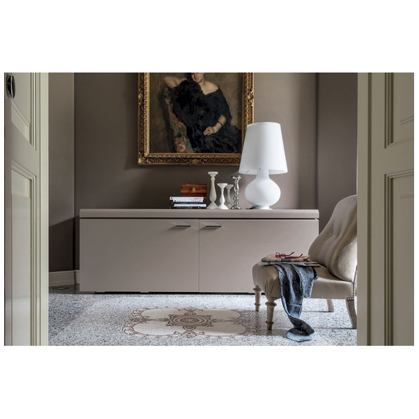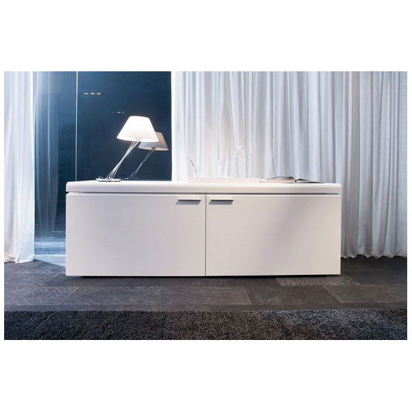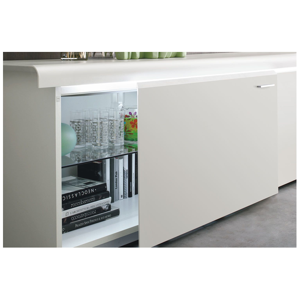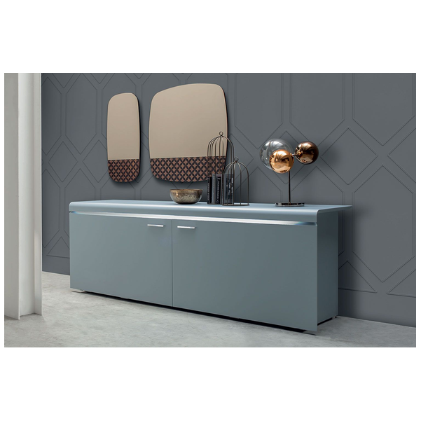 Komoda Goya firmy Tonin Casa to profesjonalna aleja do przechowywania, która łączy pragmatyzm, innowację i styl w wyrafinowaną miksturę. Wyprodukowany we Włoszech kredens Goya jest elegancki i subtelny z liniowo dominującą strukturą z zaokrąglonymi krawędziami i mechanizmem otwierania. Bufet Goya ma różne opcje matowego lakieru ramy. Przesuwane drzwi mają mechanizm otwierania i wewnętrzne wyjątkowo przezroczyste szklane półki, które są solidne i trwałe. Dla zwiększenia atrakcyjności dostępne są opcjonalnie światła LED.