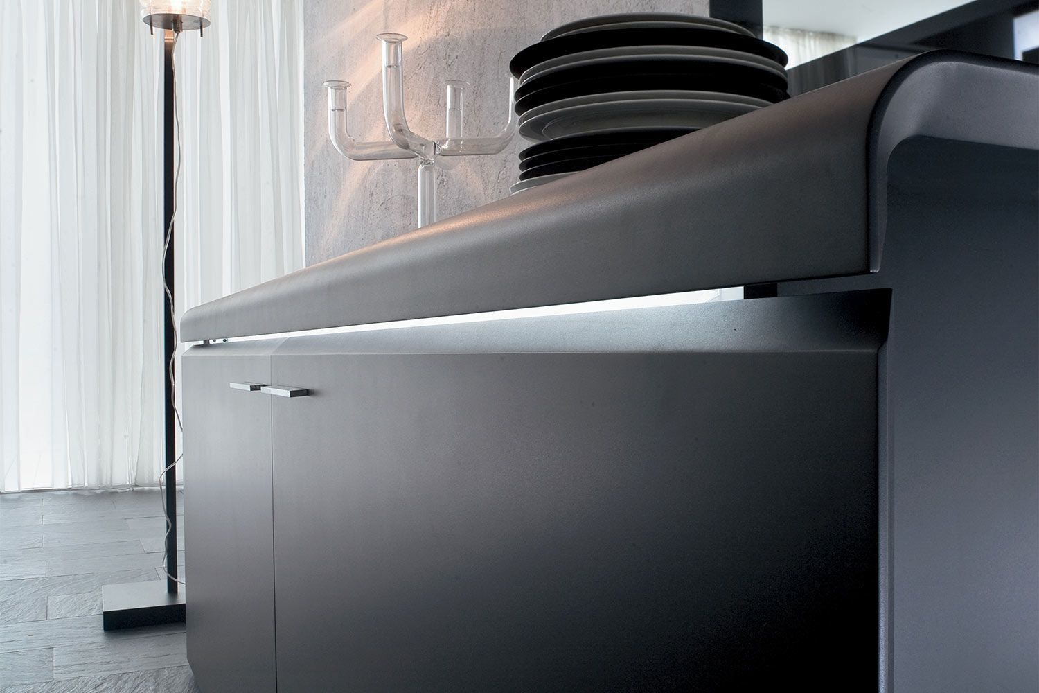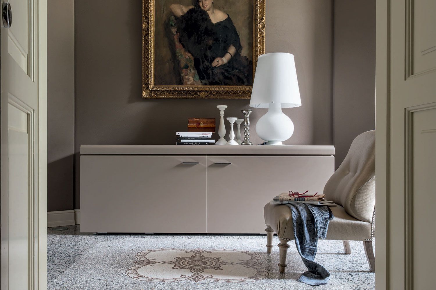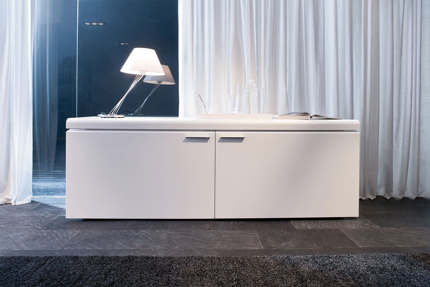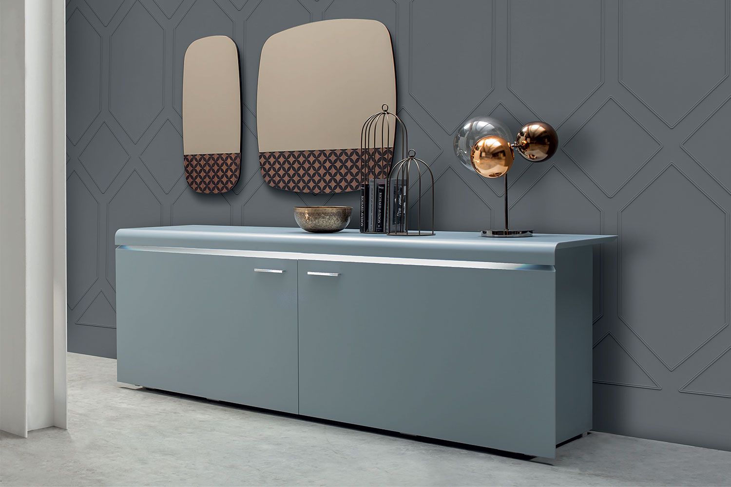 Komoda Goya firmy Tonin Casa to profesjonalna aleja do przechowywania, która łączy pragmatyzm, innowację i styl w wyrafinowaną miksturę. Wyprodukowany we Włoszech kredens Goya jest elegancki i subtelny z liniowo dominującą strukturą z zaokrąglonymi krawędziami i mechanizmem otwierania. Bufet Goya ma różne opcje matowego lakieru ramy. Przesuwane drzwi mają mechanizm otwierania i wewnętrzne wyjątkowo przezroczyste szklane półki, które są solidne i trwałe. Dla zwiększenia atrakcyjności dostępne są opcjonalnie światła LED.