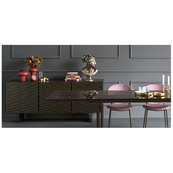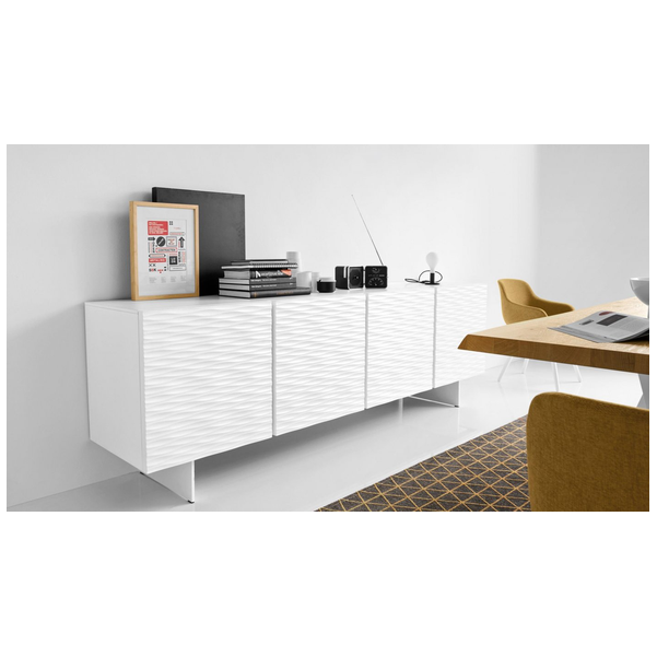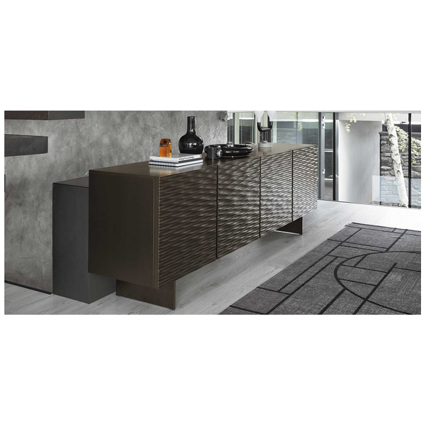 Komoda Opera z 3 przegrodami i 4 drzwiami. Wyczuwalny, dekoracyjny wygląd kredensów Opera z lakierowaną strukturą i drewnianymi drzwiami z efektem 3D. Z charakterystyczną metalową lub przezroczystą podstawą z tafli szklanej, która dodaje lekkości ramie, tworząc efekt zawieszenia. Drzwi bez uchwytów posiadają mechanizm otwierania z magnesem typu push-pull. Zawiera 2 wewnętrzne drewniane półki z możliwością wyboru 3 regulowanych wysokości.