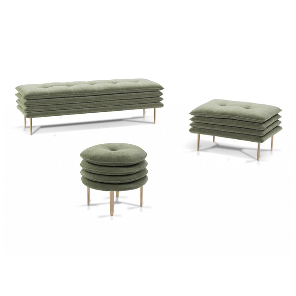 Model Mater Familias jest również dostępny jako pufa i podnóżek, oferuje prostokątne i okrągłe kształty, a także wersje ławkowe. W porównaniu z niewielkimi rozmiarami podnóżków, ławka jest dłuższą i płytszą wersją, która może służyć jako ławka w salonach lub jako podstawa łóżka do wyposażenia sypialni. Produkty te, charakteryzujące się typowymi wielowarstwowymi siedzeniami, mają na celu tworzenie nowych konfiguracji, które tworzą przestrzeń wykraczającą poza funkcjonalne podziały pomieszczeń, przekształcając je w niepowtarzalny wymiar, w których można żyć komfortowo. Poduszki siedziska wykonana są z ekologicznej pianki poliuretanowej połączonej z warstwą pianki pokrytej warstwą 100% poliestru.