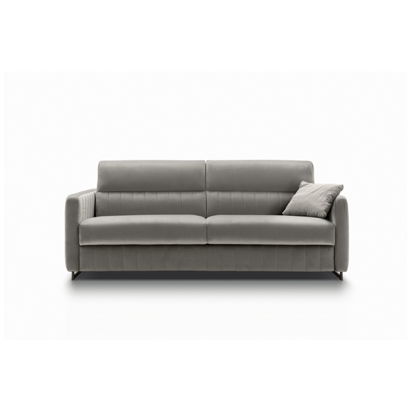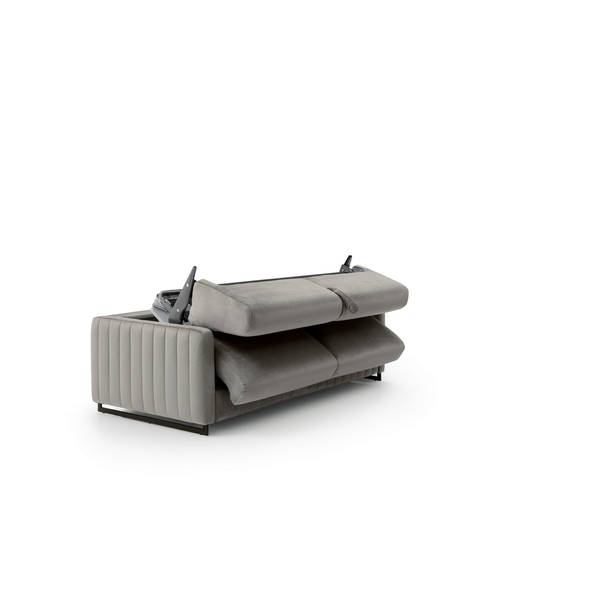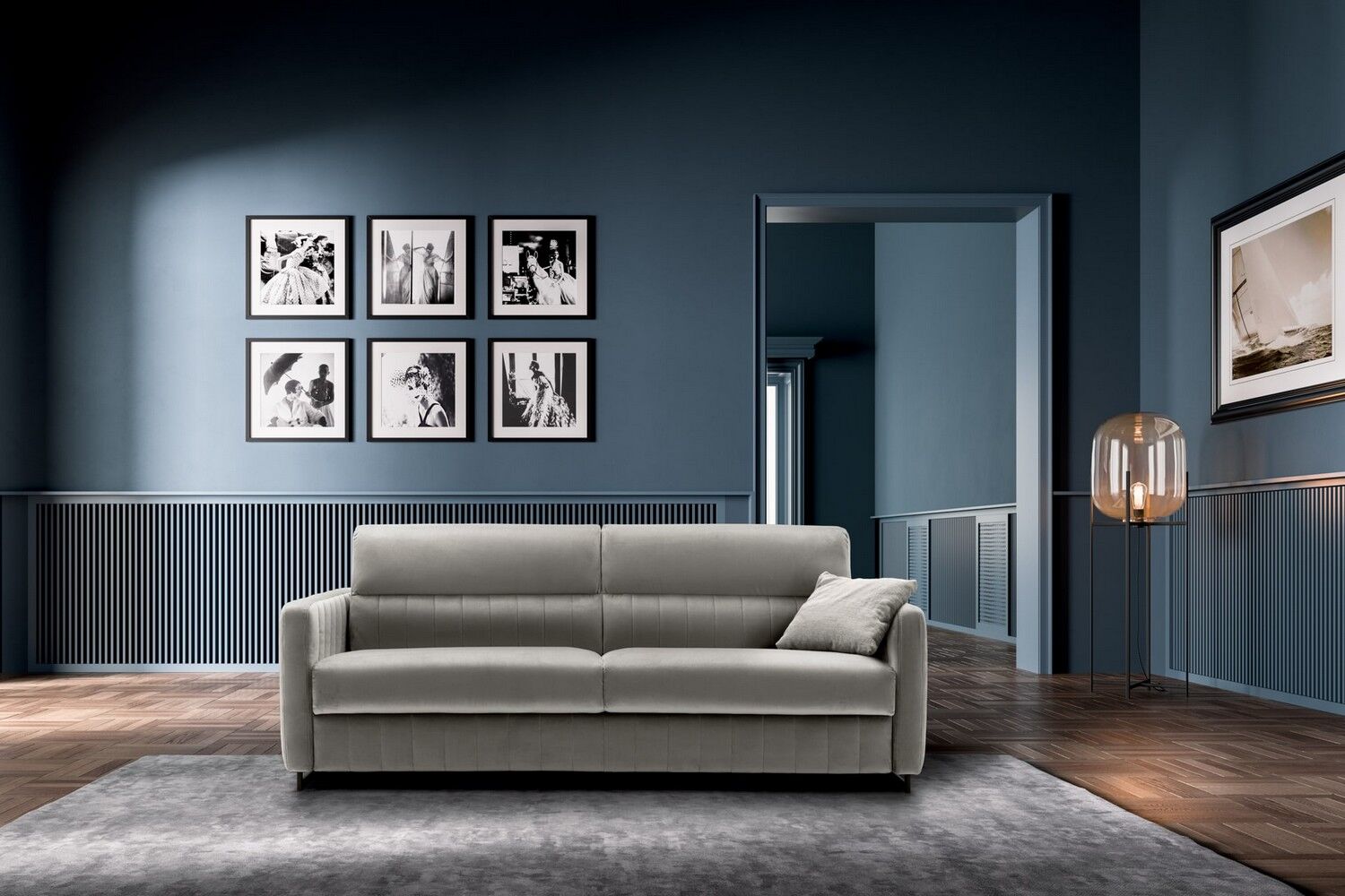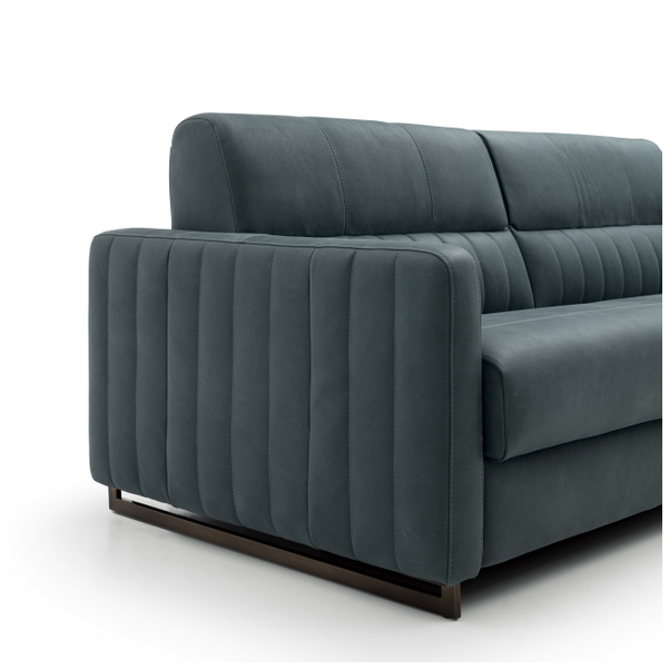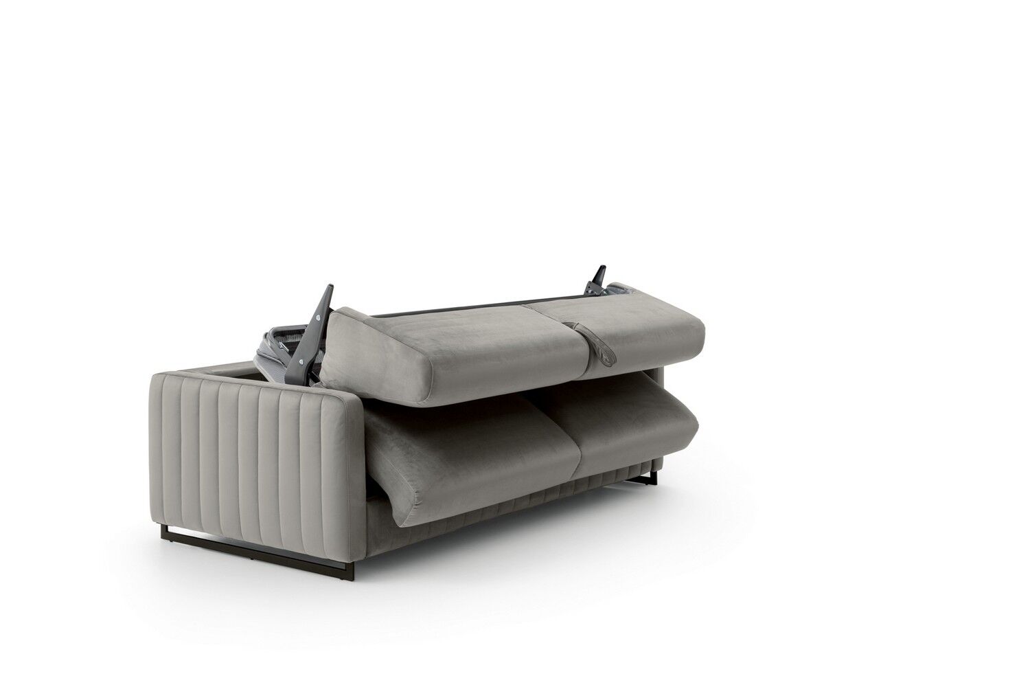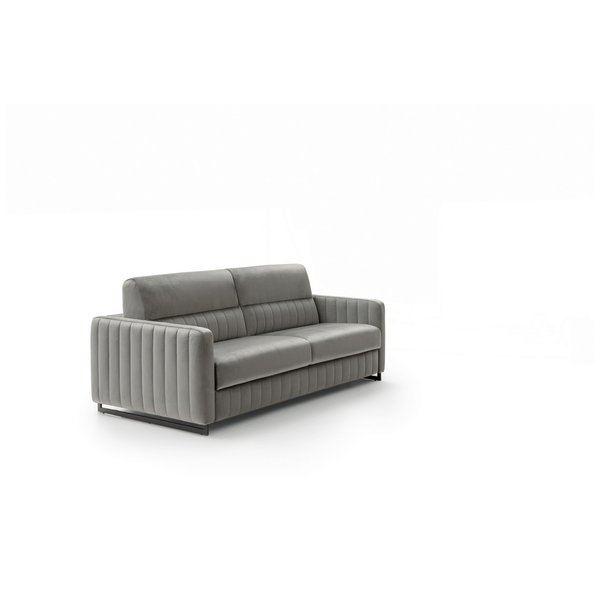 Rozkładana sofa Kleo od Nicoline Italia to obowiązkowy dodatek do nowoczesnego domu, który potrzebuje więcej opcji aranżacji. Elegancka sofa rozkłada się jednym szybkim ruchem, zmieniając ją w wygodne łóżko. Aby zwiększyć atrakcyjność, poduszki siedziska składają się pod materacem, podczas gdy poduszki oparcia również składają się do tyłu. Dzięki misternym pikowanym szwom na miękkiej tapicerce tworzy wzór w paski, który przyciąga wzrok. Idealnie nadaje się do domów, w których liczy się przestrzeń, jako atrakcyjny mebel. Wyprodukowana we Włoszech, aby zapewnić jakość, sofa do spania Kleo jest dostępna w dwóch rozmiarach, aby zaspokoić indywidualne potrzeby. Opcje tapicerki obejmują szereg tkanin i skór, szwy są wykonane z dopasowanych, jaśniejszych lub ciemniejszych kolorów. Nogi są w różnych kolorach metalu.