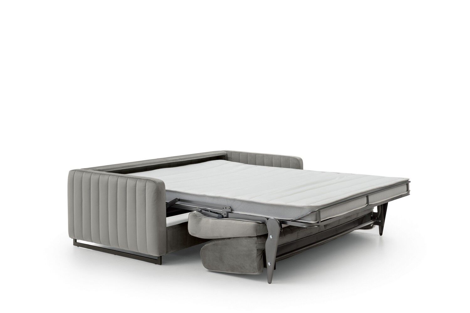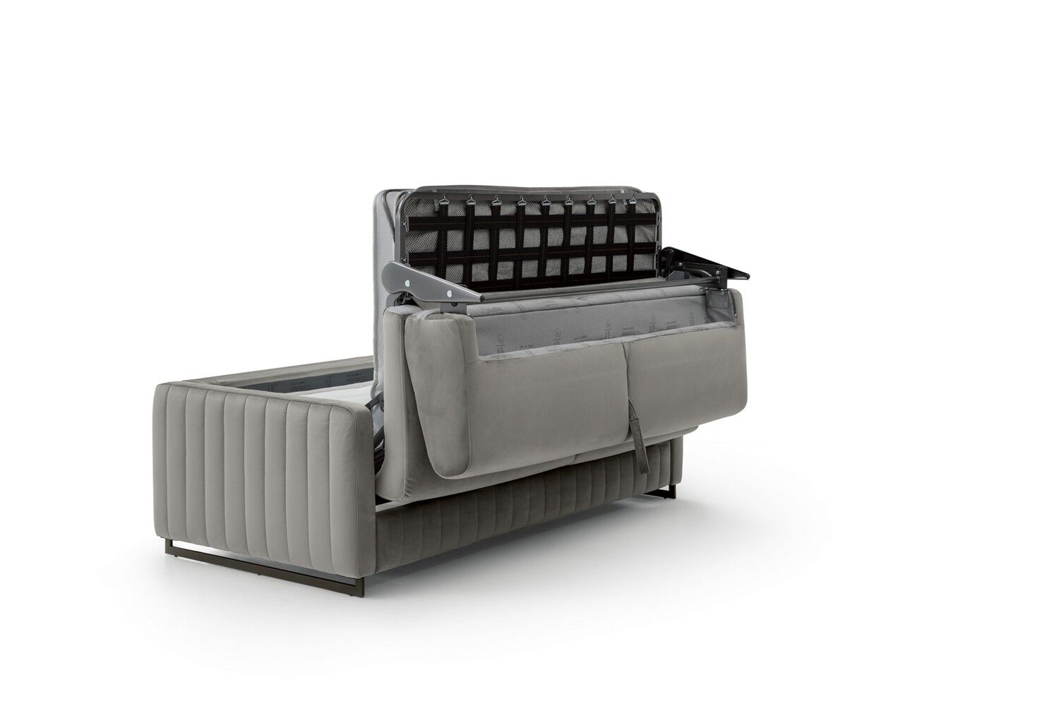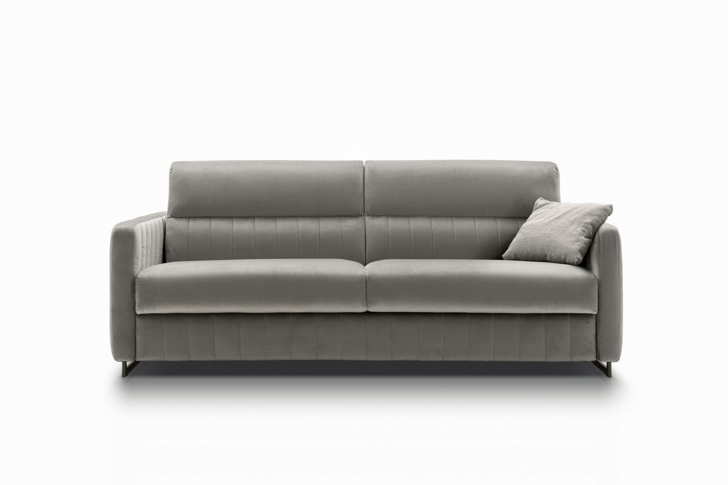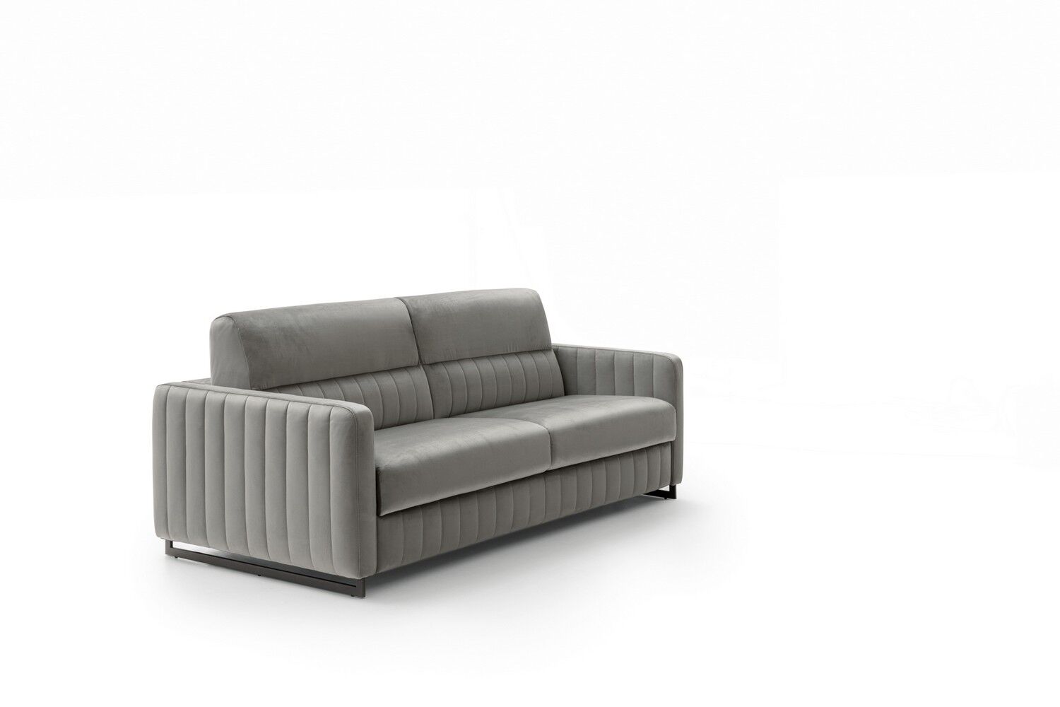 Rozkładana sofa Kleo od Nicoline Italia to obowiązkowy dodatek do nowoczesnego domu, który potrzebuje więcej opcji aranżacji. Elegancka sofa rozkłada się jednym szybkim ruchem, zmieniając ją w wygodne łóżko. Aby zwiększyć atrakcyjność, poduszki siedziska składają się pod materacem, podczas gdy poduszki oparcia również składają się do tyłu. Dzięki misternym pikowanym szwom na miękkiej tapicerce tworzy wzór w paski, który przyciąga wzrok. Idealnie nadaje się do domów, w których liczy się przestrzeń, jako atrakcyjny mebel. Wyprodukowana we Włoszech, aby zapewnić jakość, sofa do spania Kleo jest dostępna w dwóch rozmiarach, aby zaspokoić indywidualne potrzeby. Opcje tapicerki obejmują szereg tkanin i skór, szwy są wykonane z dopasowanych, jaśniejszych lub ciemniejszych kolorów. Nogi są w różnych kolorach metalu.