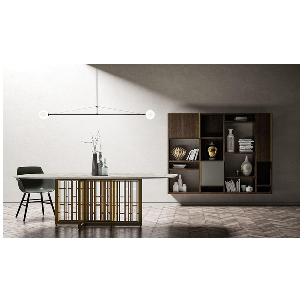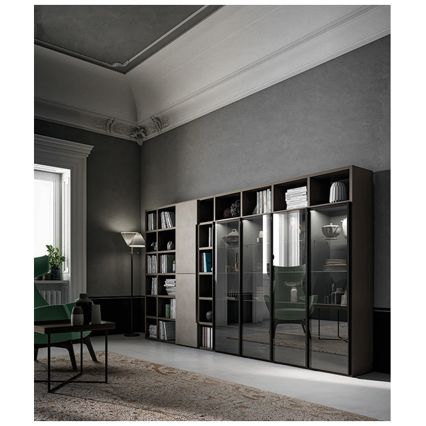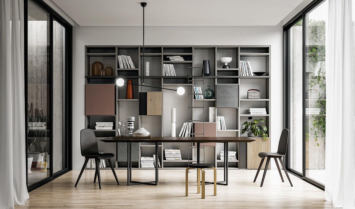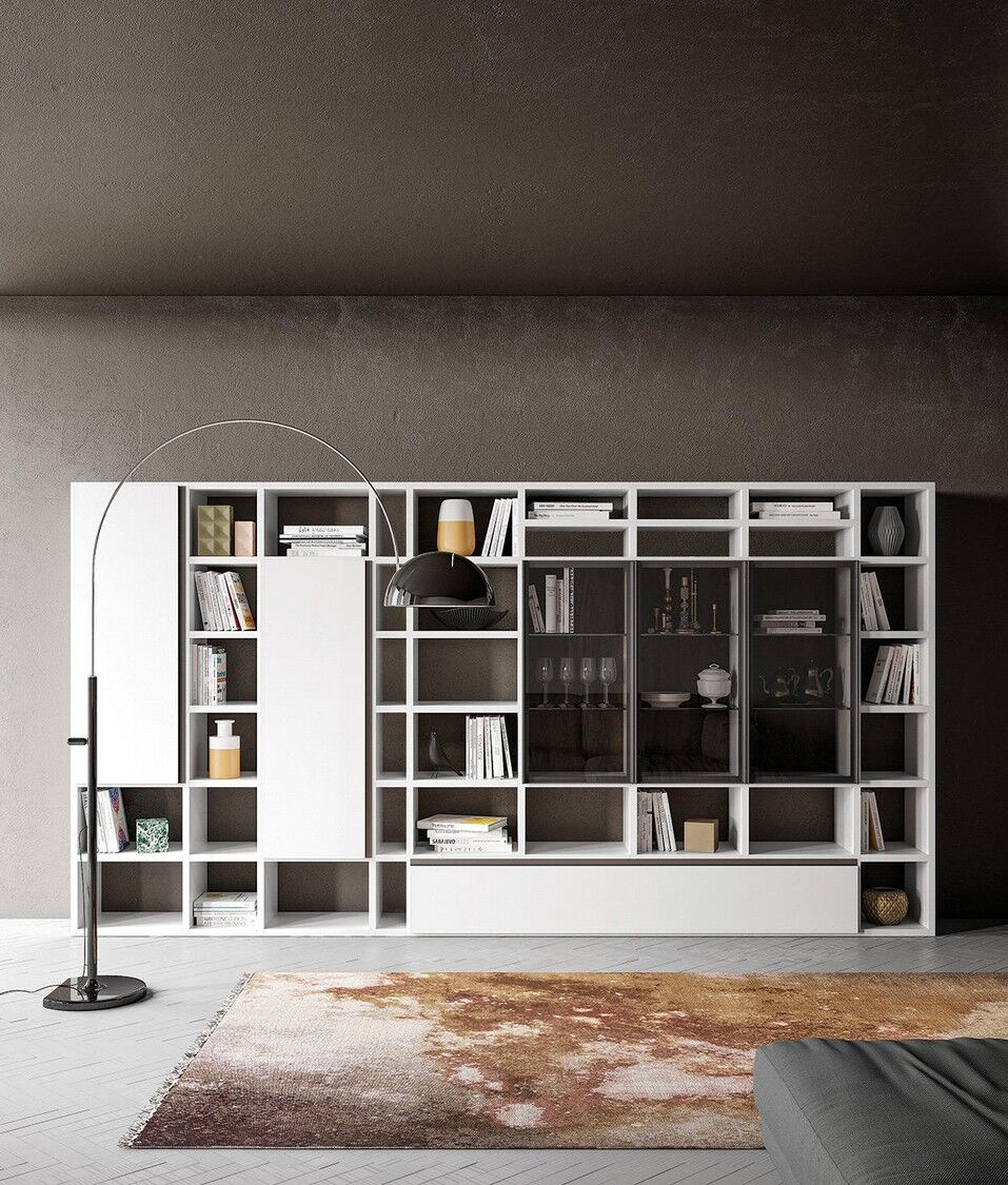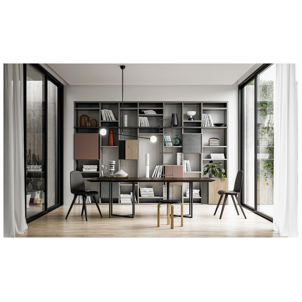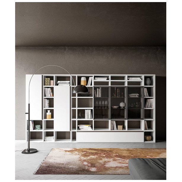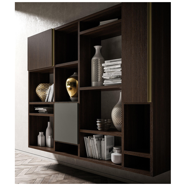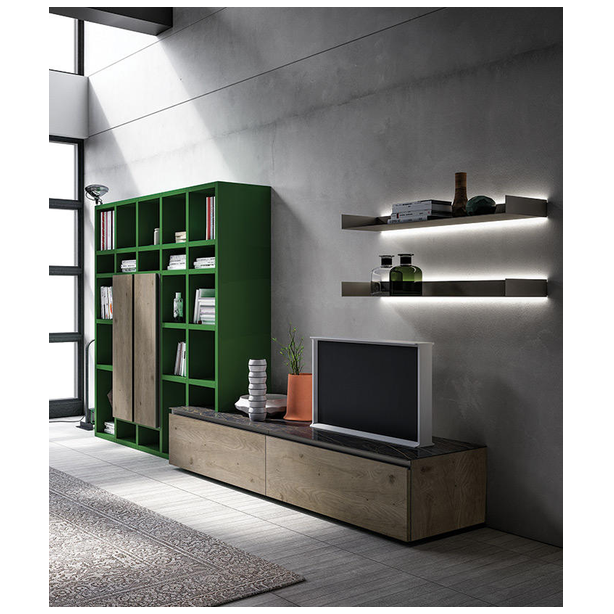 Tylny panel regału można wykonać w innym kolorze, aby przełamać schematy; półki następują po sobie o różnej grubości, mniej lub bardziej cienkie, od 30 do 15 mm, do ustawienia w wybranej pozycji; różne głębokości i grubości zmieniają się dzięki wstawieniu kontrastujących lub ton w ton elementów metalowych. Regały Speed ​​mogą być bardzo wysokie, ze względu na szeroką modułowość zarówno pod względem wysokości, jak i szerokości, telewizor leży pośrodku nośnika multimedialnego, półki są pokolorowane w różnych tonacjach: biały i szary dla eleganckiego i minimalistycznego wyposażenia, ciepła impregnowany dąb z jasnoszarymi detalami dla eleganckiego salonu.