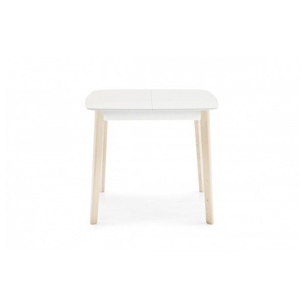 Stół z kwadratowym rozkładanym blatem i drewnianymi nogami.
