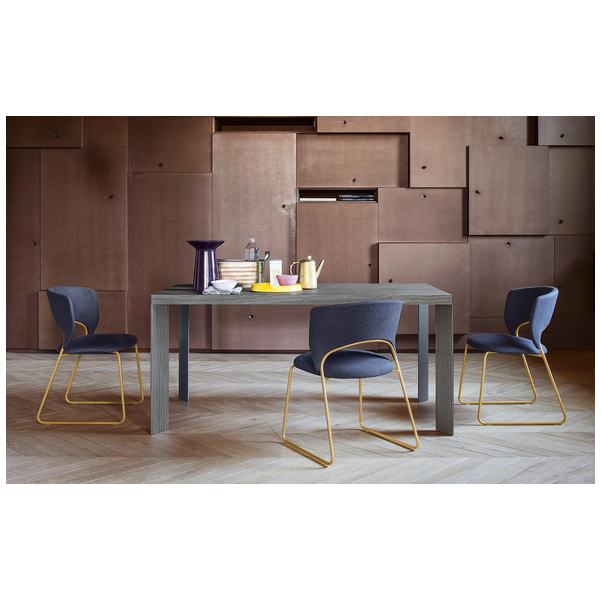 Stół posiada doskonale zintegrowany system ukryty w ramie: nogi przesuwają się na jedną stronę, co pozwala na umieszczenie na miejscu nadstawki w kolorze blatu. W ten sposób nogi zawsze pozostają w rogach, a ich walory estetyczne, wynikające z ukośnego ułożenia i powlekanego profilu metalowego, są podkreślone. Lam oferuje niezliczone możliwości kombinacji zarówno w środowisku domowym, jak i roboczym. Wybierz go, aby dodać charakteru do jadalni lub gabinetu.