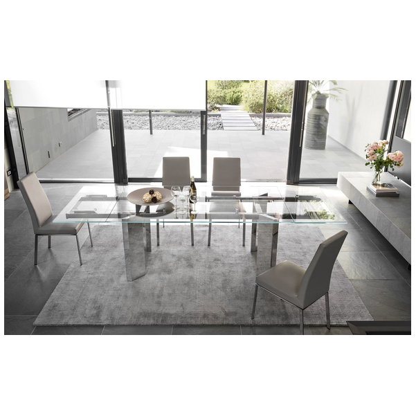 Stół rozkładany Tower ma drewniano-metalową ramę z prostokątnym blatem szklanym lub szklano-ceramicznym. Dwa boczne przedłużenia można wyciągać pojedynczo, wystarczy pociągnąć je do siebie, aby wysunąć je spod blatu i wyrównać jednym prostym ruchem. Po rozłożeniu wygodnie pomieści do 10 osób.