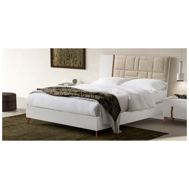 Wyrafinowanie i dbałość o szczegóły. Stylowy, nowoczesny zestaw do sypialni Sirio, wyprodukowany we Włoszech przez Status, ma białe wykończenie na wysoki połysk, drewniane akcenty z nogami w tym samym kolorze i zagłówkiem obitym ekoskórą. Łóżko ma stelaż z drewnianych listew. Zestaw składa się z łóżka typu queen size, 2 szafki nocne, podwójna komoda i lustro.